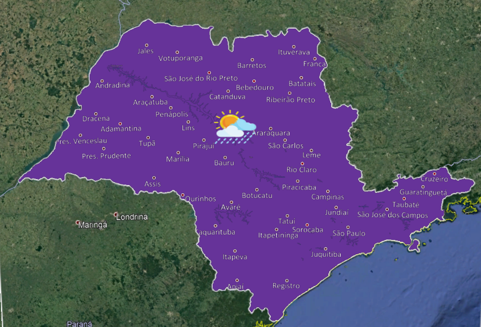 Chuvas moderadas/fortes nas regiões de Araçatuba, Ibirá, Potirendaba, Macaubal, Morro Agudo, Orlândia, Ituverava, Miguelópolis e Buritizal
