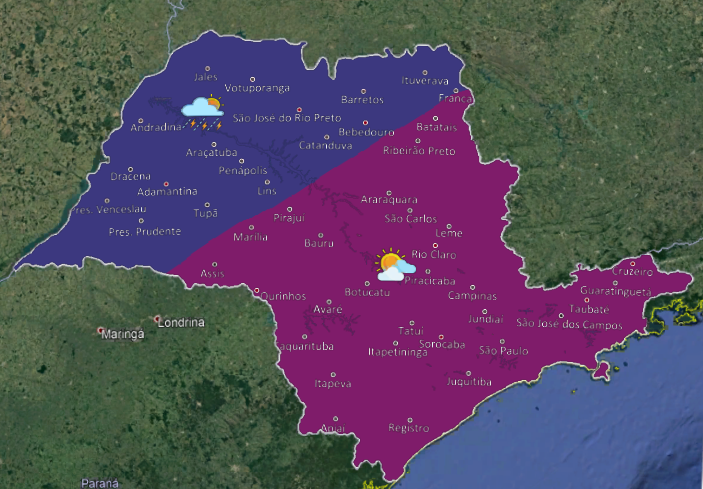 Chuvas moderadas a fortes no setor oeste do estado de São Paulo, nos municípios de Rancharia, Martinópolis, Araçatuba, Novo Horizonte, Santo Antônio do Aracanguá, Tanabi, Bauru e São Joé do Rio Preto, entre outros.