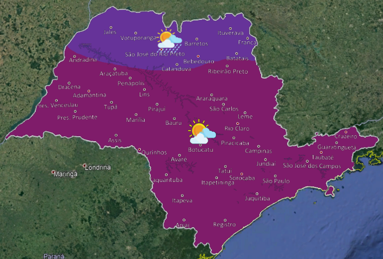 Chuvas isoladas no estado de São Paulo, nas regiões dos municípios de Teodoro Sampaio, Gavião Peixoto, Taquaritinga, Matão e Olímpia, entre outros.