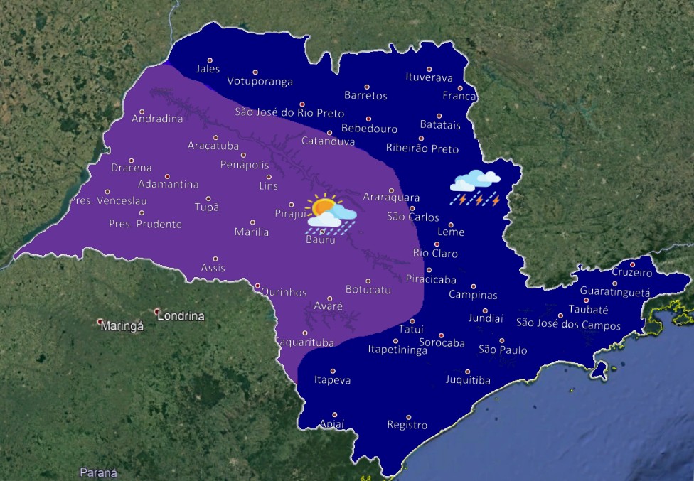 Chuvas moderadas a fortes nos municípios de Quatá, Paraguaçu Paulista, Corumbataí Analândia, Porangaba, Piracicaba, Guapiára e Eldorado.