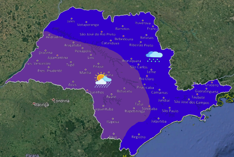 Chuvas fracas e isoladas no norte, nordeste e leste do estado de São Paulo